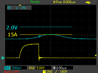 желтый - тестовый импульс тока на входе 5А/дел - напряжение на шунте 1 Ом)